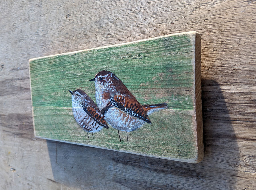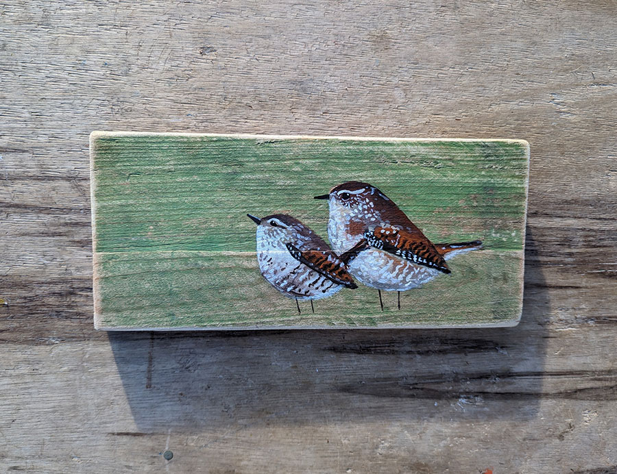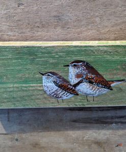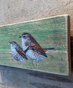 Original acrylic painting of a pair of Wren’s. Painted on a gorgeous piece of green stained reclaimed wood.