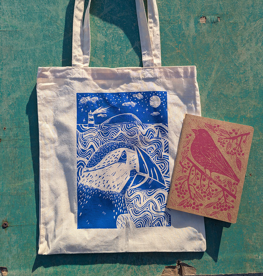 This hand printed cotton tote bag is beautifully reproduced from Liz Toole’s linocut Navigating. Inspired by Penmon Point in Anglesey, Its combined with an Eco friendly hand printed note/sketchbook