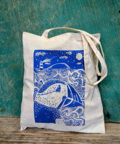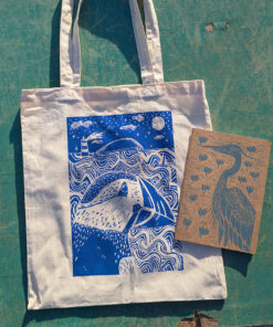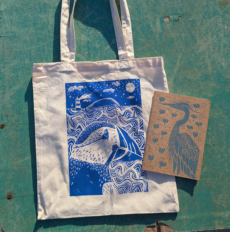 This hand printed cotton tote bag is beautifully reproduced from Liz Toole’s linocut Navigating. Inspired by Penmon Point in Anglesey, Its combined with an Eco friendly hand printed note/sketchbook