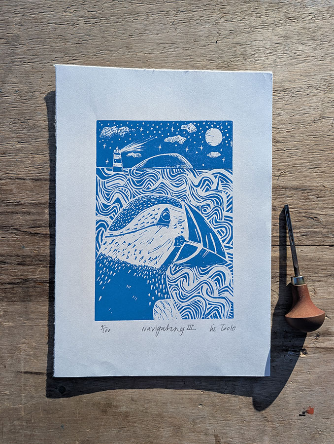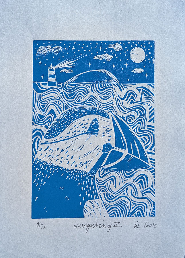 Limited edition hand printed Lino cut featuring Penmon Point and a puffin, inspired by Anglesey