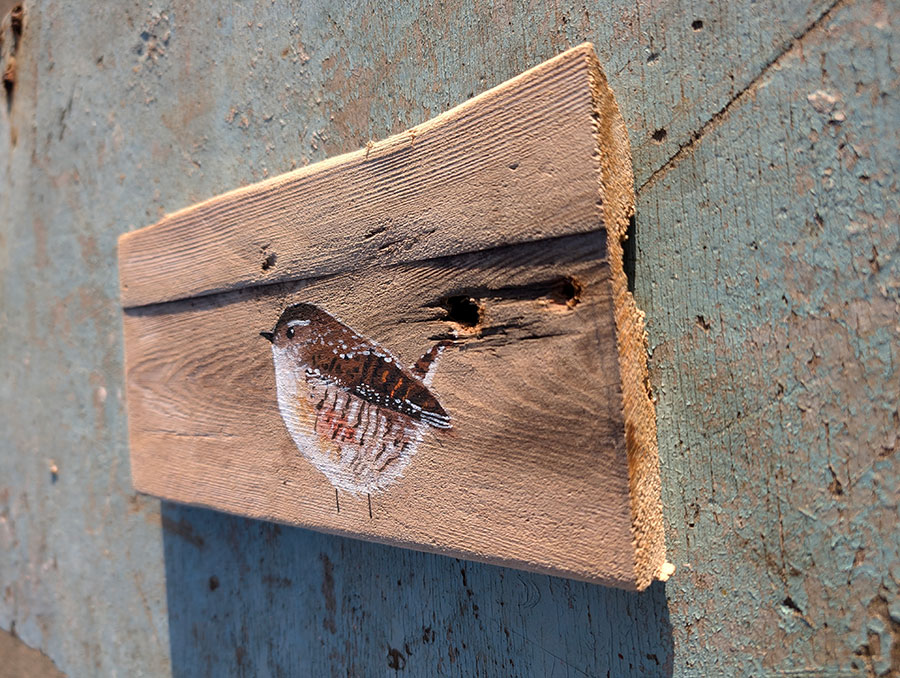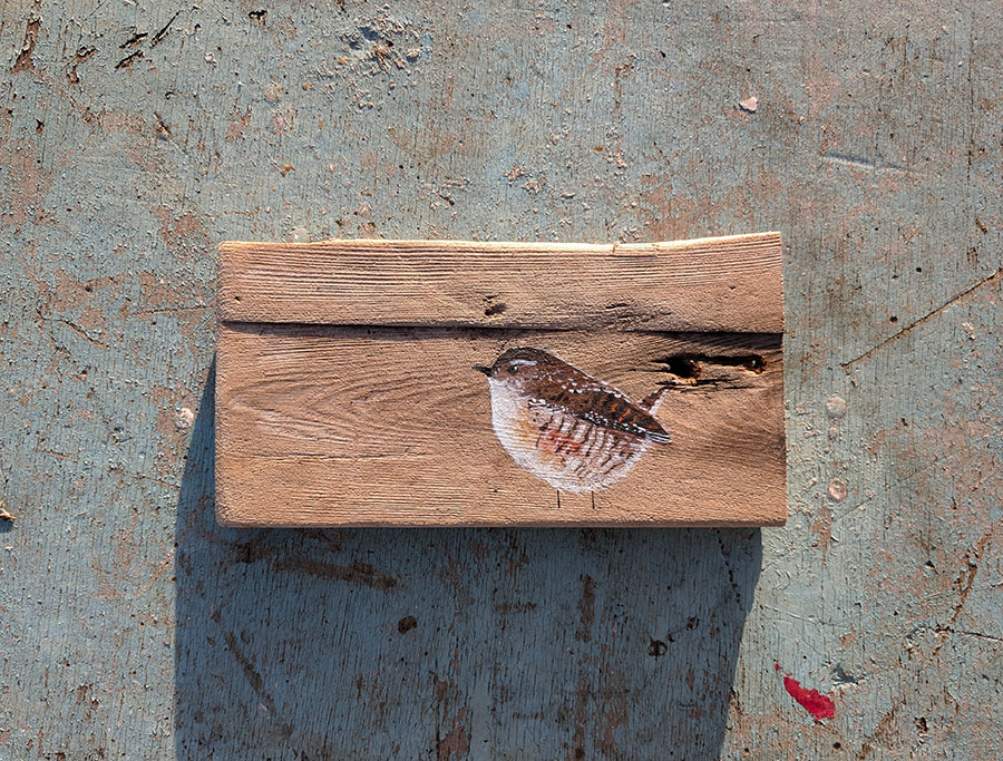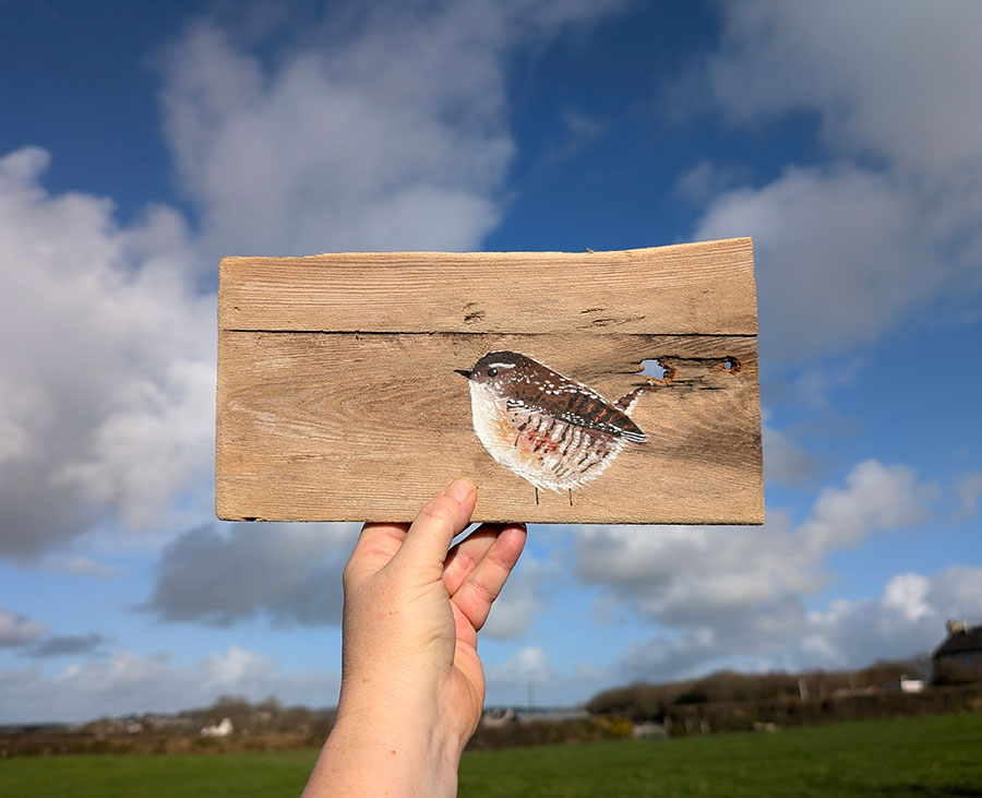 Original acrylic painting of a Wren. This is a lovely smooth piece of Welsh driftwood, complete witth a couple of holes. I genuinely love finding wood with holes.